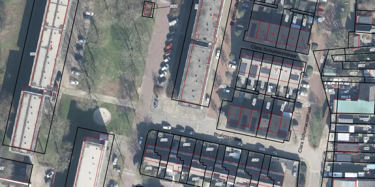 Het perceel waarop Brahmsstraat 47 staat heeft een oppervlakte van 2106 m². Dit is een zeer groot perceel. De perceeloppervlakte wordt geregistreerd door het Kadaster. Gedetailleerde informatie over de maten van dit perceel kunt u vinden in het rapport Kadastrale kaart met maatvoering van Brahmsstraat 47.