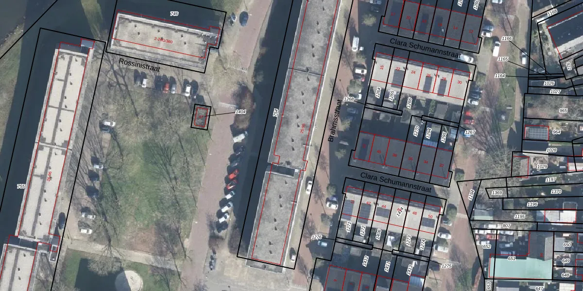 Het perceel waarop Brahmsstraat 65 staat heeft een oppervlakte van 2106 m². Dit is een zeer groot perceel. De perceeloppervlakte wordt geregistreerd door het Kadaster. Gedetailleerde informatie over de maten van dit perceel kunt u vinden in het rapport Kadastrale kaart met maatvoering van Brahmsstraat 65.