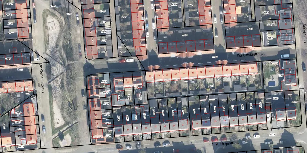 Het perceel waarop Da Costastraat 26 staat heeft een oppervlakte van 1450 m². Dit is een zeer groot perceel. De perceeloppervlakte wordt geregistreerd door het Kadaster. Gedetailleerde informatie over de maten van dit perceel kunt u vinden in het rapport Kadastrale kaart met maatvoering van Da Costastraat 26.