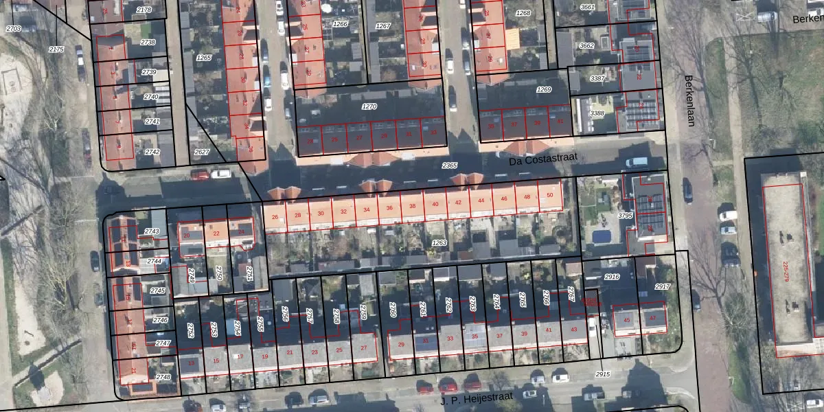 Het perceel waarop Da Costastraat 38 staat heeft een oppervlakte van 1450 m². Dit is een zeer groot perceel. De perceeloppervlakte wordt geregistreerd door het Kadaster. Gedetailleerde informatie over de maten van dit perceel kunt u vinden in het rapport Kadastrale kaart met maatvoering van Da Costastraat 38.