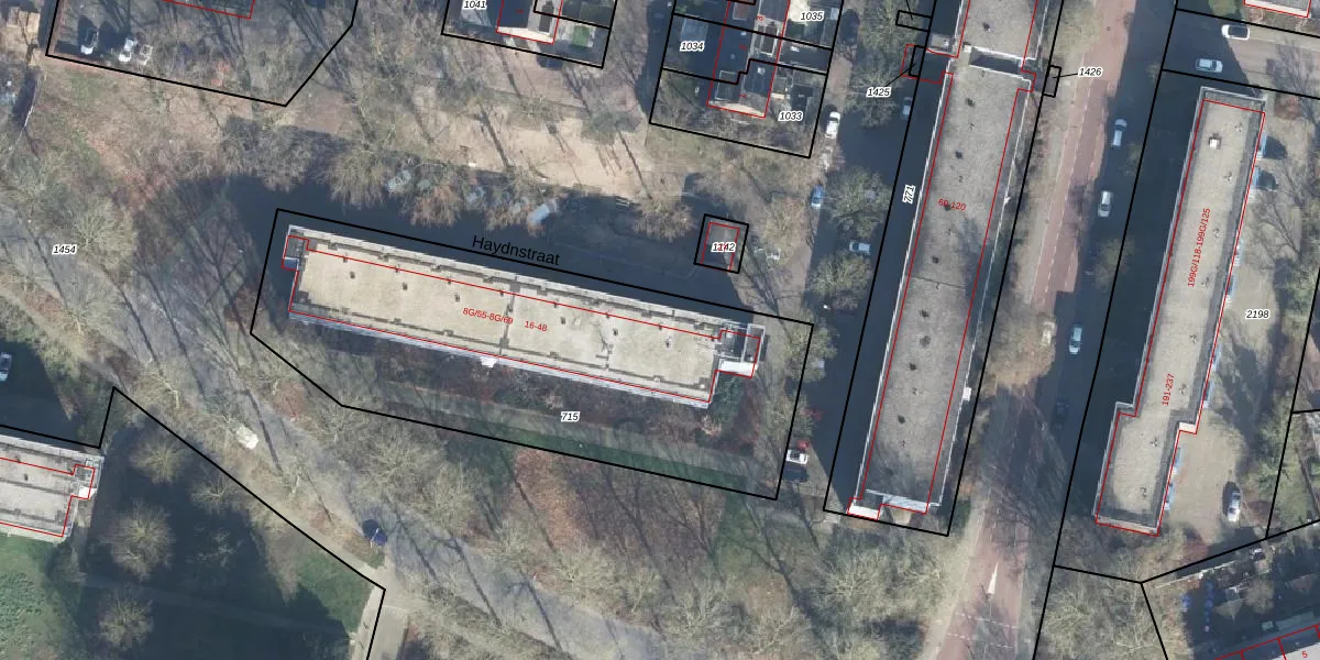 Het perceel waarop Haydnstraat 8-G-55 staat heeft een oppervlakte van 2182 m². Dit is een zeer groot perceel. De perceeloppervlakte wordt geregistreerd door het Kadaster. Gedetailleerde informatie over de maten van dit perceel kunt u vinden in het rapport Kadastrale kaart met maatvoering van Haydnstraat 8-G-55.