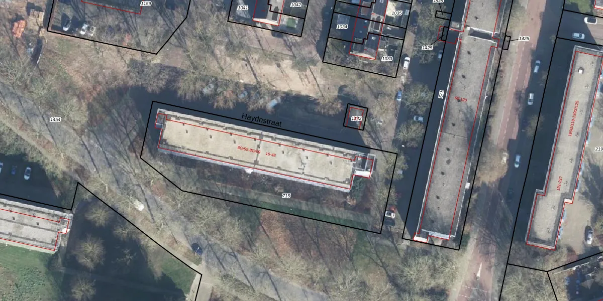 Het perceel waarop Haydnstraat 8-G-57 staat heeft een oppervlakte van 2182 m². Dit is een zeer groot perceel. De perceeloppervlakte wordt geregistreerd door het Kadaster. Gedetailleerde informatie over de maten van dit perceel kunt u vinden in het rapport Kadastrale kaart met maatvoering van Haydnstraat 8-G-57.