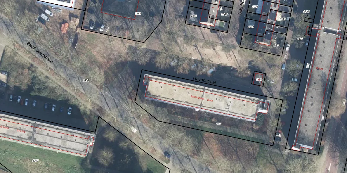 Het perceel waarop Haydnstraat 8-G-65 staat heeft een oppervlakte van 2182 m². Dit is een zeer groot perceel. De perceeloppervlakte wordt geregistreerd door het Kadaster. Gedetailleerde informatie over de maten van dit perceel kunt u vinden in het rapport Kadastrale kaart met maatvoering van Haydnstraat 8-G-65.
