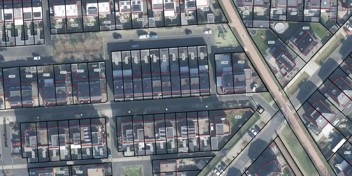 Het perceel waarop Hemmingstraat 41 staat heeft een oppervlakte van 155 m². Dit is een middelgroot perceel. De perceeloppervlakte wordt geregistreerd door het Kadaster. Gedetailleerde informatie over de maten van dit perceel kunt u vinden in het rapport Kadastrale kaart met maatvoering van Hemmingstraat 41.
