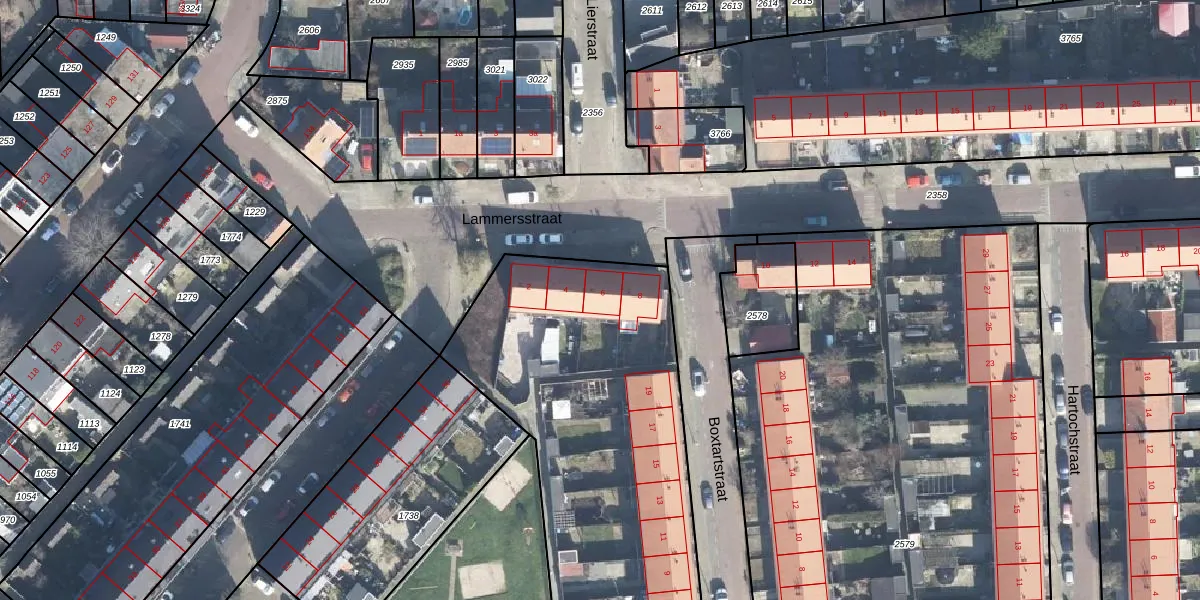 Het perceel waarop Lammersstraat 6 staat heeft een oppervlakte van 4645 m². Dit is een zeer groot perceel. De perceeloppervlakte wordt geregistreerd door het Kadaster. Gedetailleerde informatie over de maten van dit perceel kunt u vinden in het rapport Kadastrale kaart met maatvoering van Lammersstraat 6.