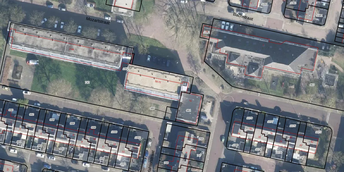 Het perceel waarop Mozartstraat 50-a staat heeft een oppervlakte van 3594 m². Dit is een zeer groot perceel. De perceeloppervlakte wordt geregistreerd door het Kadaster. Gedetailleerde informatie over de maten van dit perceel kunt u vinden in het rapport Kadastrale kaart met maatvoering van Mozartstraat 50-a.