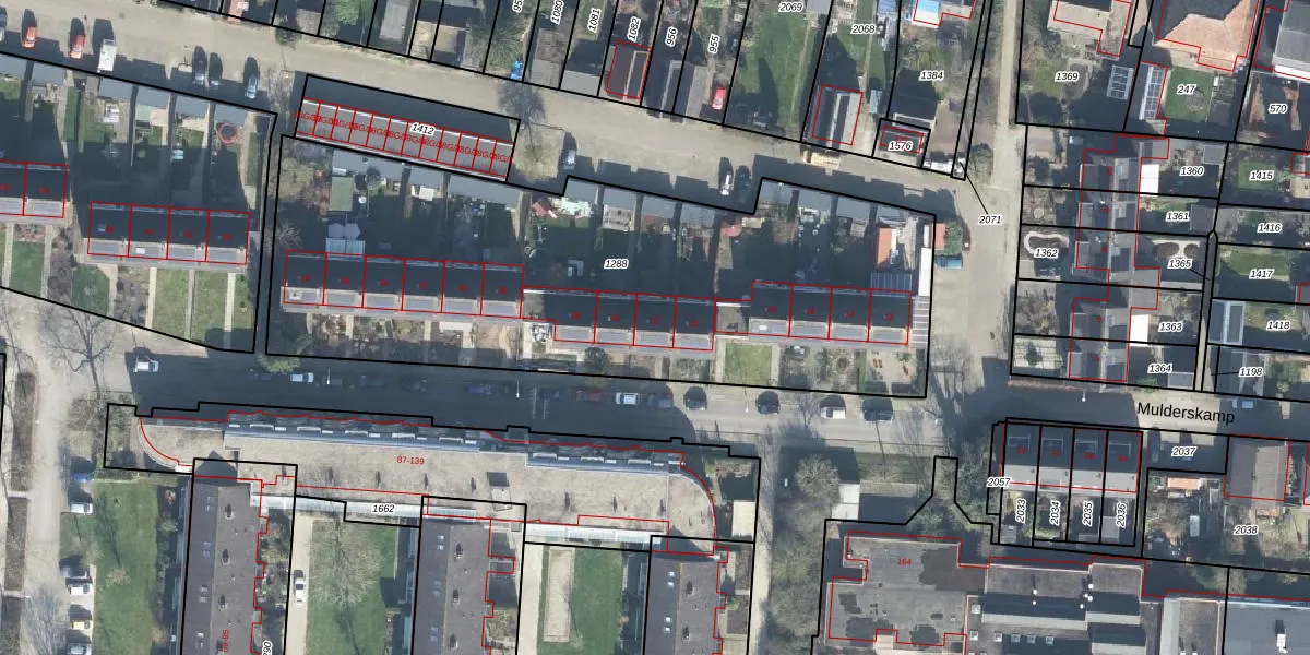 Het perceel waarop Mulderskamp 22 staat heeft een oppervlakte van 2956 m². Dit is een zeer groot perceel. De perceeloppervlakte wordt geregistreerd door het Kadaster. Gedetailleerde informatie over de maten van dit perceel kunt u vinden in het rapport Kadastrale kaart met maatvoering van Mulderskamp 22.