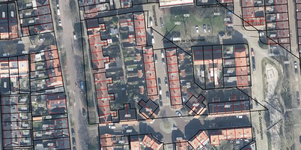 Het perceel waarop Staringstraat 16 staat heeft een oppervlakte van 243 m². Dit is een middelgroot perceel. De perceeloppervlakte wordt geregistreerd door het Kadaster. Gedetailleerde informatie over de maten van dit perceel kunt u vinden in het rapport Kadastrale kaart met maatvoering van Staringstraat 16.