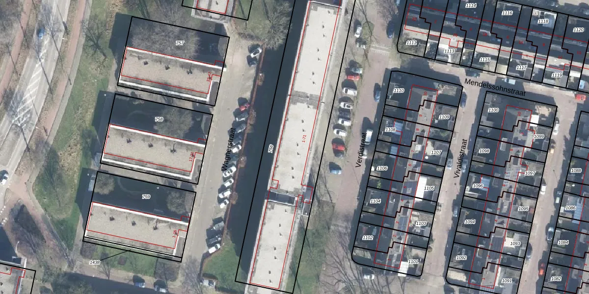 Het perceel waarop Verdistraat 43 staat heeft een oppervlakte van 2106 m². Dit is een zeer groot perceel. De perceeloppervlakte wordt geregistreerd door het Kadaster. Gedetailleerde informatie over de maten van dit perceel kunt u vinden in het rapport Kadastrale kaart met maatvoering van Verdistraat 43.