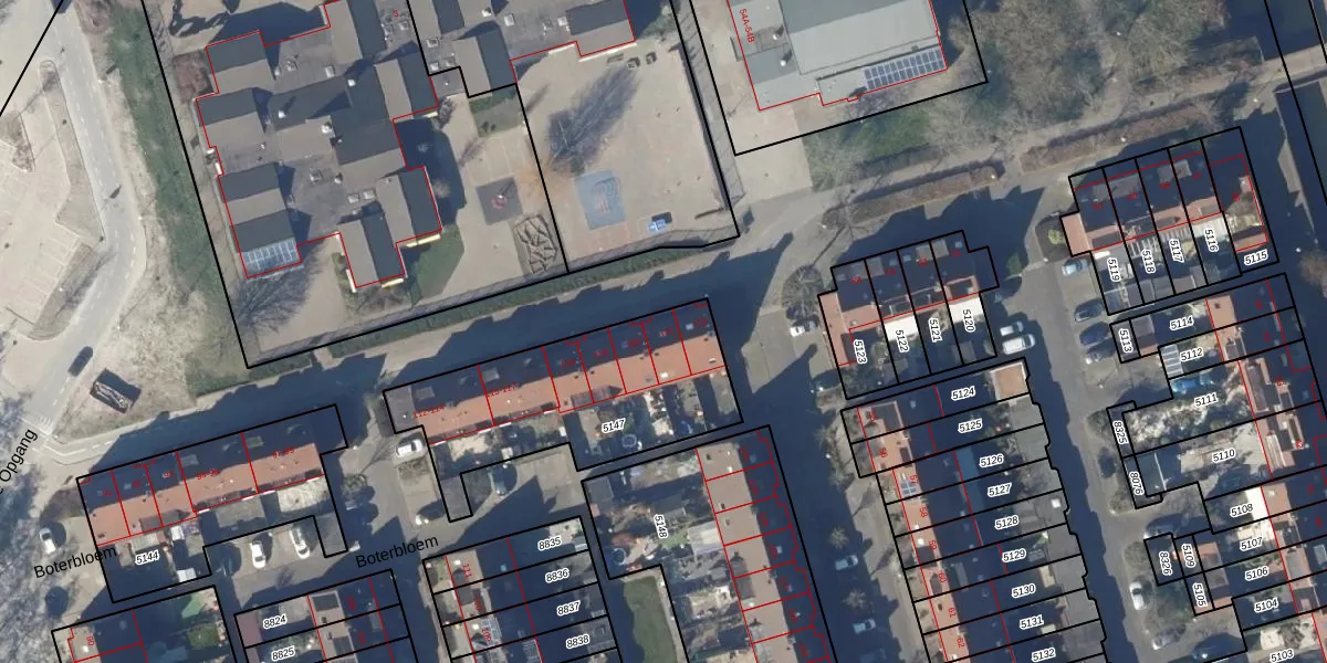 Het perceel waarop Boterbloem 121 staat heeft een oppervlakte van 869 m². Dit is een groot perceel. De perceeloppervlakte wordt geregistreerd door het Kadaster. Gedetailleerde informatie over de maten van dit perceel kunt u vinden in het rapport Kadastrale kaart met maatvoering van Boterbloem 121.