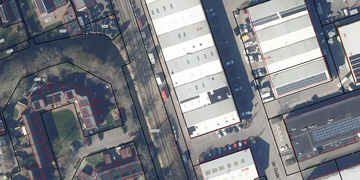 Het perceel waarop de Oude Veiling 36 staat heeft een oppervlakte van 2896 m². Dit is een zeer groot perceel. De perceeloppervlakte wordt geregistreerd door het Kadaster. Gedetailleerde informatie over de maten van dit perceel kunt u vinden in het rapport Kadastrale kaart met maatvoering van de Oude Veiling 36.