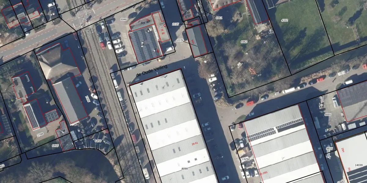 Het perceel waarop de Oude Veiling 51 staat heeft een oppervlakte van 2896 m². Dit is een zeer groot perceel. De perceeloppervlakte wordt geregistreerd door het Kadaster. Gedetailleerde informatie over de maten van dit perceel kunt u vinden in het rapport Kadastrale kaart met maatvoering van de Oude Veiling 51.
