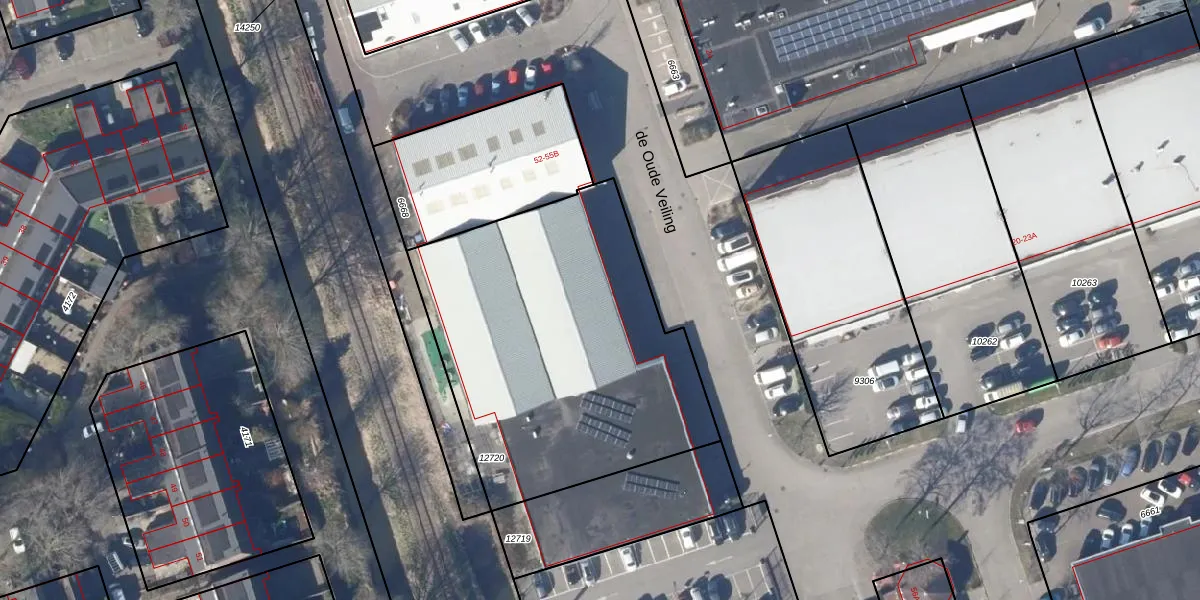 Het perceel waarop de Oude Veiling 54 staat heeft een oppervlakte van 1757 m². Dit is een zeer groot perceel. De perceeloppervlakte wordt geregistreerd door het Kadaster. Gedetailleerde informatie over de maten van dit perceel kunt u vinden in het rapport Kadastrale kaart met maatvoering van de Oude Veiling 54.