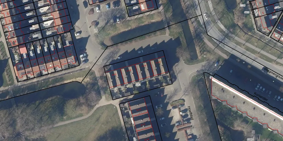 Het perceel waarop Hoefblad 44 staat heeft een oppervlakte van 1069 m². Dit is een zeer groot perceel. De perceeloppervlakte wordt geregistreerd door het Kadaster. Gedetailleerde informatie over de maten van dit perceel kunt u vinden in het rapport Kadastrale kaart met maatvoering van Hoefblad 44.