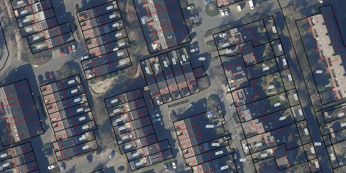 Kosterstuin 196 is gelegen op kadastraal perceel HOO00I8785. Deze kadastrale aanduiding is uniek en wordt gebruikt door het Kadaster om eigendomsrechten en andere zakelijke rechten vast te leggen. Het perceel maakt onderdeel uit van de kadastrale gemeente Hoorn.