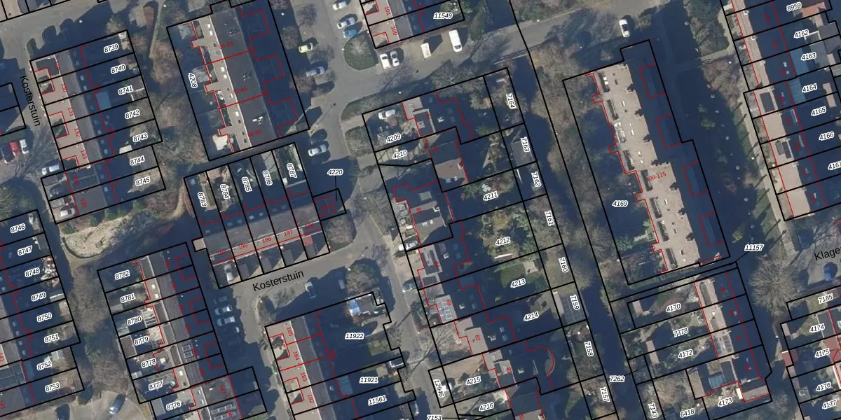 Het perceel waarop Kosterstuin 85 staat heeft een oppervlakte van 387 m². Dit is een groot perceel. De perceeloppervlakte wordt geregistreerd door het Kadaster. Gedetailleerde informatie over de maten van dit perceel kunt u vinden in het rapport Kadastrale kaart met maatvoering van Kosterstuin 85.