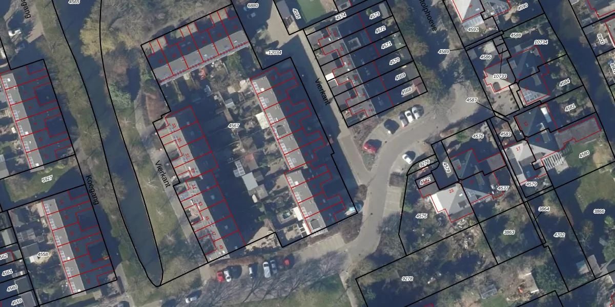 Het perceel waarop Vierkant 9 staat heeft een oppervlakte van 3445 m². Dit is een zeer groot perceel. De perceeloppervlakte wordt geregistreerd door het Kadaster. Gedetailleerde informatie over de maten van dit perceel kunt u vinden in het rapport Kadastrale kaart met maatvoering van Vierkant 9.
