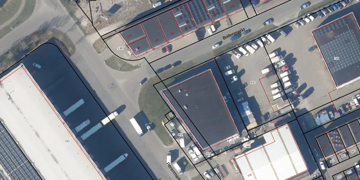 Het perceel waarop Bollenmarkt 15 staat heeft een oppervlakte van 1320 m². Dit is een zeer groot perceel. De perceeloppervlakte wordt geregistreerd door het Kadaster. Gedetailleerde informatie over de maten van dit perceel kunt u vinden in het rapport Kadastrale kaart met maatvoering van Bollenmarkt 15.