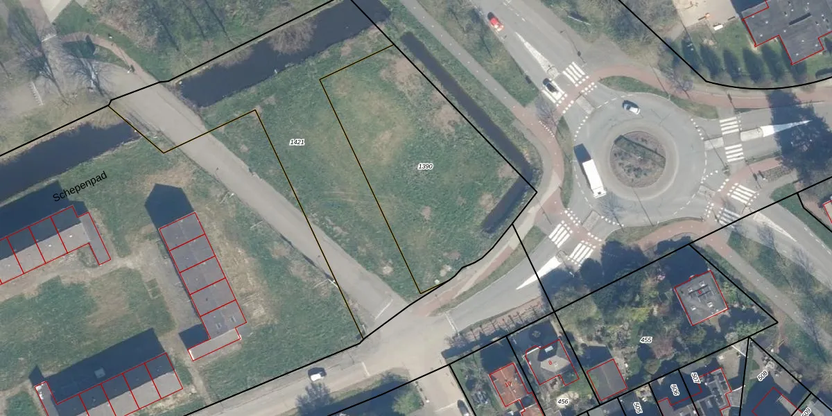 Het perceel waarop Schepenpad 57 staat heeft een oppervlakte van 1546 m². Dit is een zeer groot perceel. De perceeloppervlakte wordt geregistreerd door het Kadaster. Gedetailleerde informatie over de maten van dit perceel kunt u vinden in het rapport Kadastrale kaart met maatvoering van Schepenpad 57.