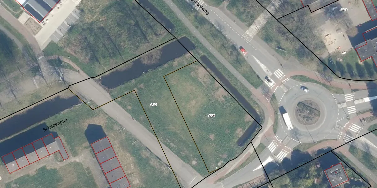 Het perceel waarop Schepenpad 69 staat heeft een oppervlakte van 1546 m². Dit is een zeer groot perceel. De perceeloppervlakte wordt geregistreerd door het Kadaster. Gedetailleerde informatie over de maten van dit perceel kunt u vinden in het rapport Kadastrale kaart met maatvoering van Schepenpad 69.