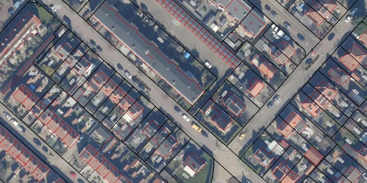Het perceel waarop Friedalaan 77 staat heeft een oppervlakte van 1837 m². Dit is een zeer groot perceel. De perceeloppervlakte wordt geregistreerd door het Kadaster. Gedetailleerde informatie over de maten van dit perceel kunt u vinden in het rapport Kadastrale kaart met maatvoering van Friedalaan 77.