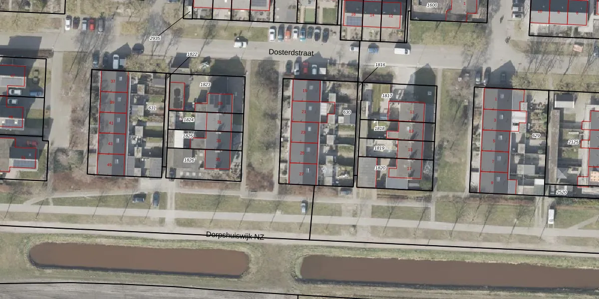 Het perceel waarop Dosterdstraat 25 staat heeft een oppervlakte van 878 m². Dit is een groot perceel. De perceeloppervlakte wordt geregistreerd door het Kadaster. Gedetailleerde informatie over de maten van dit perceel kunt u vinden in het rapport Kadastrale kaart met maatvoering van Dosterdstraat 25.