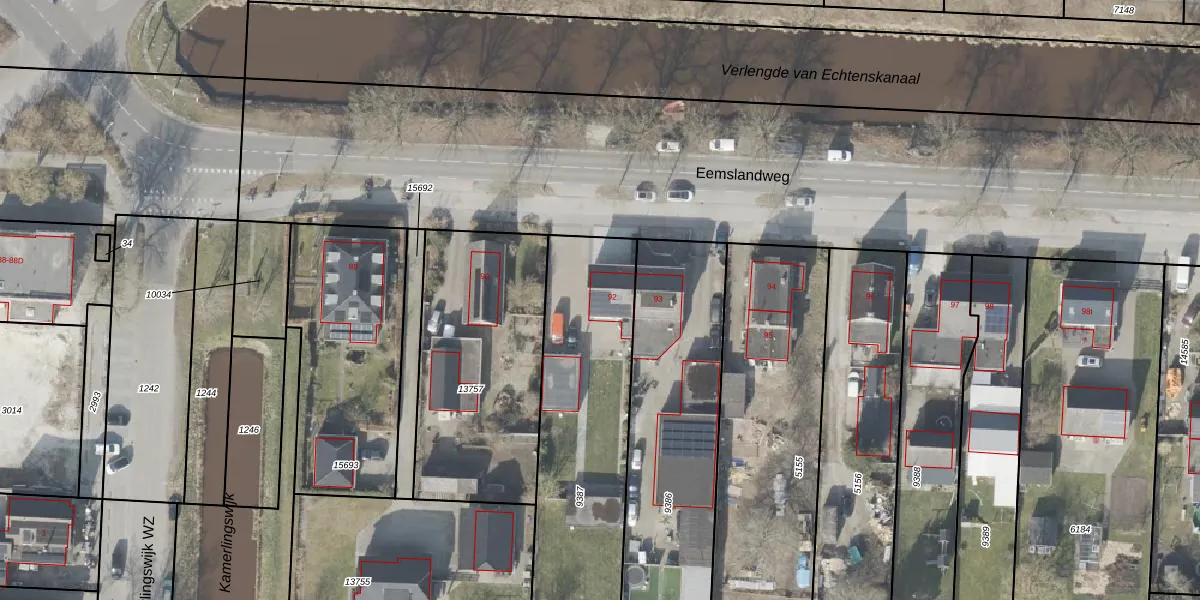 Eemslandweg 92 is gelegen op kadastraal perceel EMN00I9387. Deze kadastrale aanduiding is uniek en wordt gebruikt door het Kadaster om eigendomsrechten en andere zakelijke rechten vast te leggen. Het perceel maakt onderdeel uit van de kadastrale gemeente Emmen.