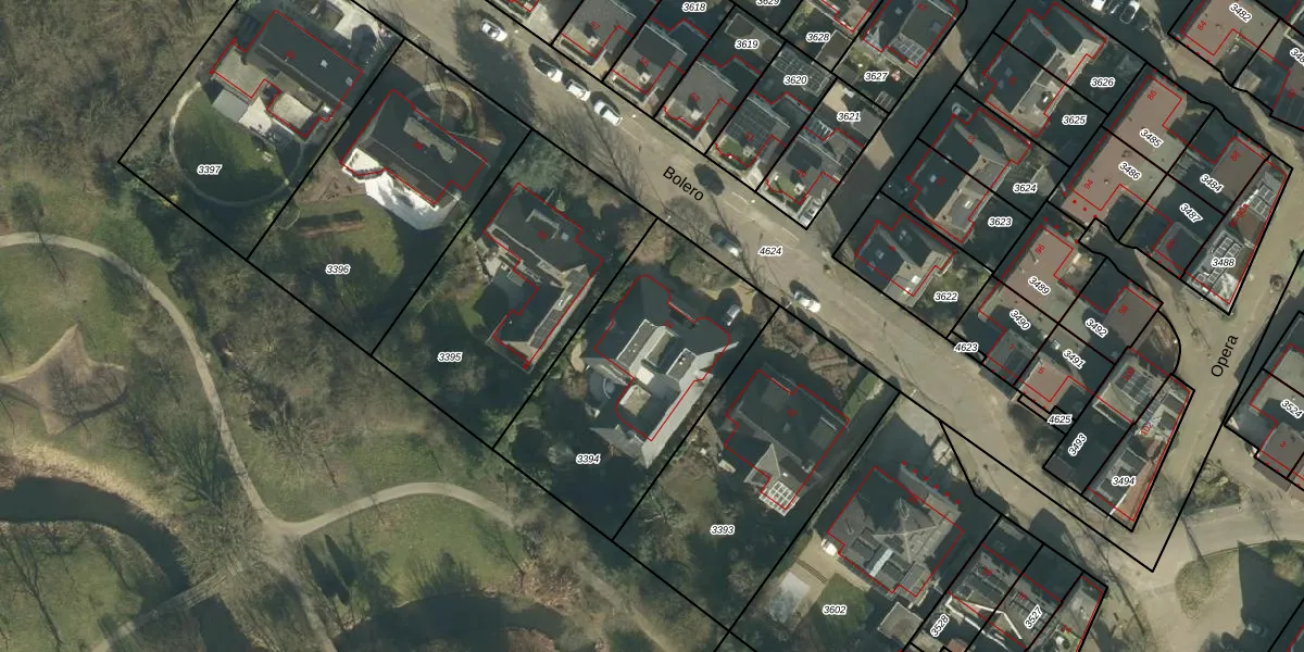 Het perceel waarop Bolero 24 staat heeft een oppervlakte van 1015 m². Dit is een zeer groot perceel. De perceeloppervlakte wordt geregistreerd door het Kadaster. Gedetailleerde informatie over de maten van dit perceel kunt u vinden in het rapport Kadastrale kaart met maatvoering van Bolero 24.
