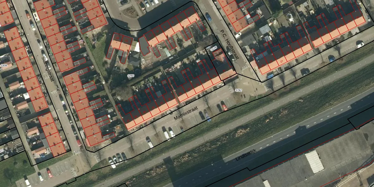 Het perceel waarop Marnixstraat 34 staat heeft een oppervlakte van 6168 m². Dit is een zeer groot perceel. De perceeloppervlakte wordt geregistreerd door het Kadaster. Gedetailleerde informatie over de maten van dit perceel kunt u vinden in het rapport Kadastrale kaart met maatvoering van Marnixstraat 34.