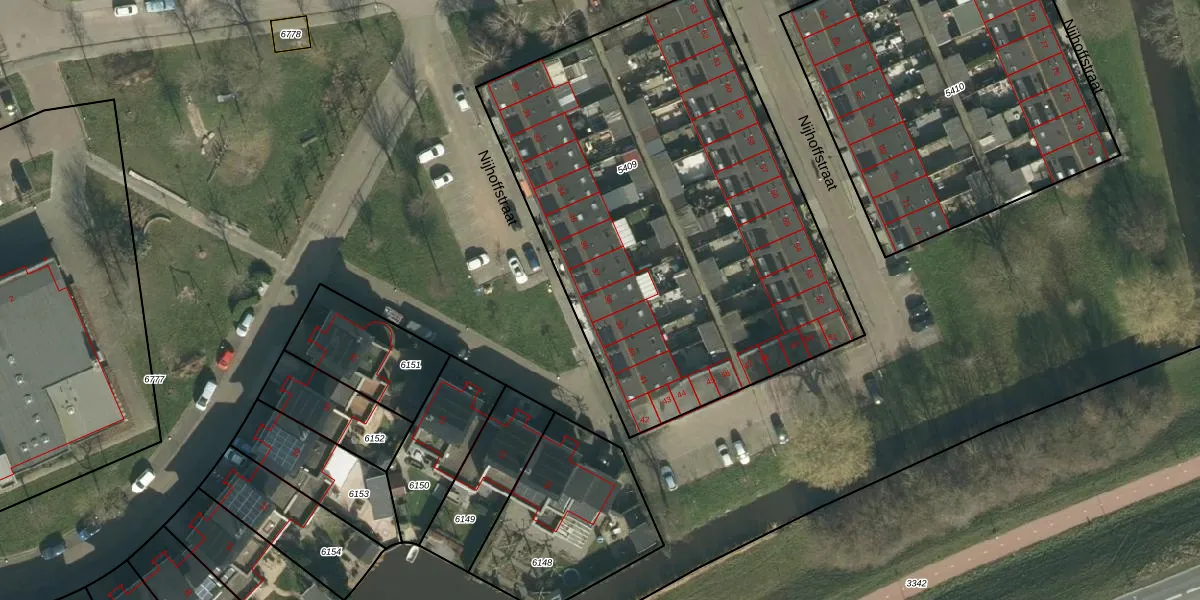 Het perceel waarop Nijhoffstraat 38 staat heeft een oppervlakte van 2723 m². Dit is een zeer groot perceel. De perceeloppervlakte wordt geregistreerd door het Kadaster. Gedetailleerde informatie over de maten van dit perceel kunt u vinden in het rapport Kadastrale kaart met maatvoering van Nijhoffstraat 38.