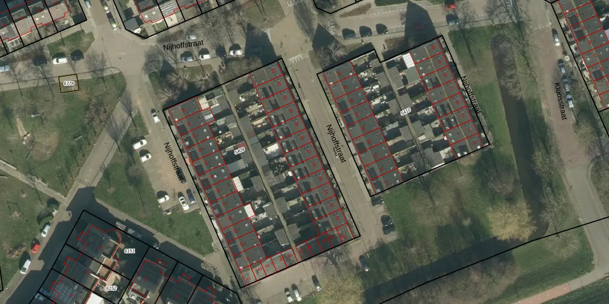 Het perceel waarop Nijhoffstraat 57 staat heeft een oppervlakte van 2723 m². Dit is een zeer groot perceel. De perceeloppervlakte wordt geregistreerd door het Kadaster. Gedetailleerde informatie over de maten van dit perceel kunt u vinden in het rapport Kadastrale kaart met maatvoering van Nijhoffstraat 57.