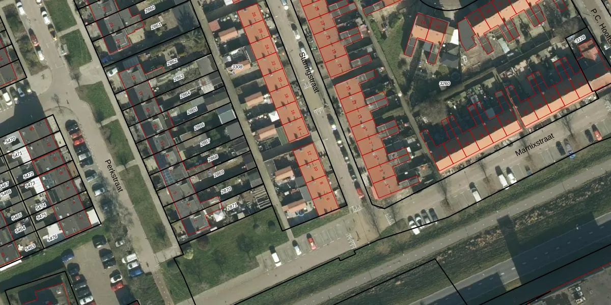 Het perceel waarop Staringstraat 12 staat heeft een oppervlakte van 2606 m². Dit is een zeer groot perceel. De perceeloppervlakte wordt geregistreerd door het Kadaster. Gedetailleerde informatie over de maten van dit perceel kunt u vinden in het rapport Kadastrale kaart met maatvoering van Staringstraat 12.