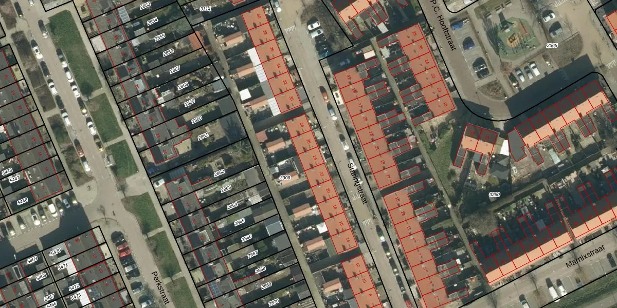 Het perceel waarop Staringstraat 24 staat heeft een oppervlakte van 2606 m². Dit is een zeer groot perceel. De perceeloppervlakte wordt geregistreerd door het Kadaster. Gedetailleerde informatie over de maten van dit perceel kunt u vinden in het rapport Kadastrale kaart met maatvoering van Staringstraat 24.
