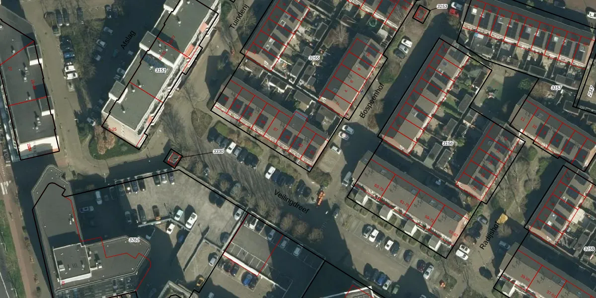 Het perceel waarop Veilingdreef 83 staat heeft een oppervlakte van 2737 m². Dit is een zeer groot perceel. De perceeloppervlakte wordt geregistreerd door het Kadaster. Gedetailleerde informatie over de maten van dit perceel kunt u vinden in het rapport Kadastrale kaart met maatvoering van Veilingdreef 83.