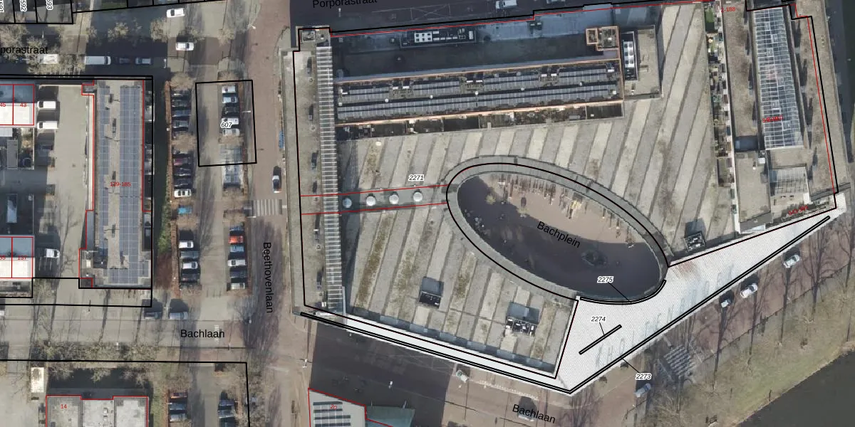 Het perceel waarop Bachplein 6 staat heeft een oppervlakte van 7247 m². Dit is een zeer groot perceel. De perceeloppervlakte wordt geregistreerd door het Kadaster. Gedetailleerde informatie over de maten van dit perceel kunt u vinden in het rapport Kadastrale kaart met maatvoering van Bachplein 6.
