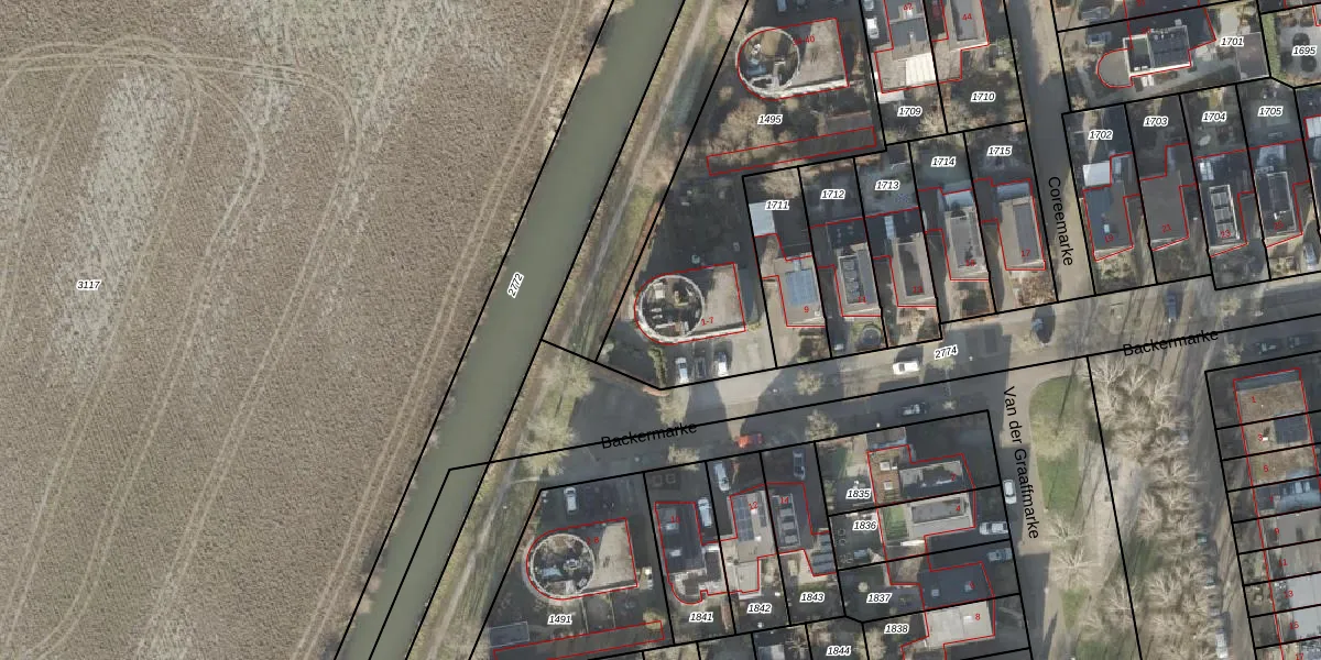 Het perceel waarop Backermarke 1 staat heeft een oppervlakte van 1290 m². Dit is een zeer groot perceel. De perceeloppervlakte wordt geregistreerd door het Kadaster. Gedetailleerde informatie over de maten van dit perceel kunt u vinden in het rapport Kadastrale kaart met maatvoering van Backermarke 1.