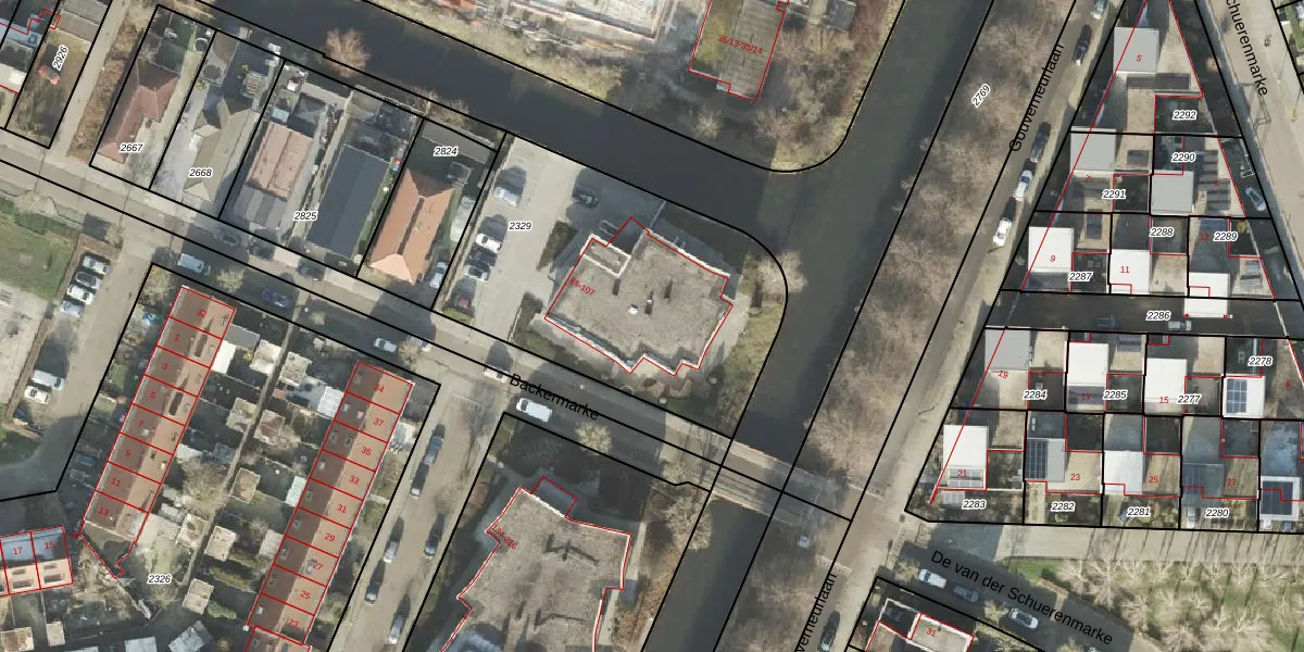 Het perceel waarop Backermarke 105 staat heeft een oppervlakte van 1474 m². Dit is een zeer groot perceel. De perceeloppervlakte wordt geregistreerd door het Kadaster. Gedetailleerde informatie over de maten van dit perceel kunt u vinden in het rapport Kadastrale kaart met maatvoering van Backermarke 105.