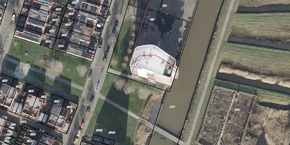 Het perceel waarop Beeldsnijderstraat 191 staat heeft een oppervlakte van 4033 m². Dit is een zeer groot perceel. De perceeloppervlakte wordt geregistreerd door het Kadaster. Gedetailleerde informatie over de maten van dit perceel kunt u vinden in het rapport Kadastrale kaart met maatvoering van Beeldsnijderstraat 191.