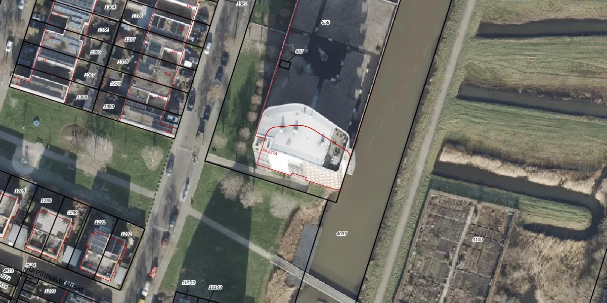 Het perceel waarop Beeldsnijderstraat 227-A staat heeft een oppervlakte van 4033 m². Dit is een zeer groot perceel. De perceeloppervlakte wordt geregistreerd door het Kadaster. Gedetailleerde informatie over de maten van dit perceel kunt u vinden in het rapport Kadastrale kaart met maatvoering van Beeldsnijderstraat 227-A.