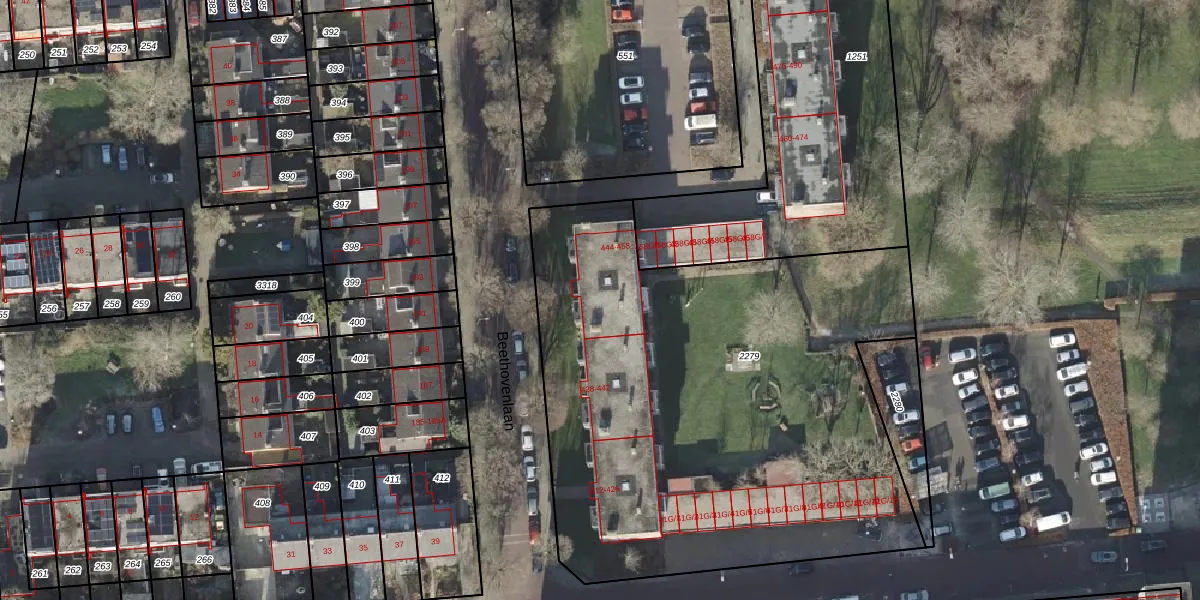 Het perceel waarop Beethovenlaan 450 staat heeft een oppervlakte van 3180 m². Dit is een zeer groot perceel. De perceeloppervlakte wordt geregistreerd door het Kadaster. Gedetailleerde informatie over de maten van dit perceel kunt u vinden in het rapport Kadastrale kaart met maatvoering van Beethovenlaan 450.