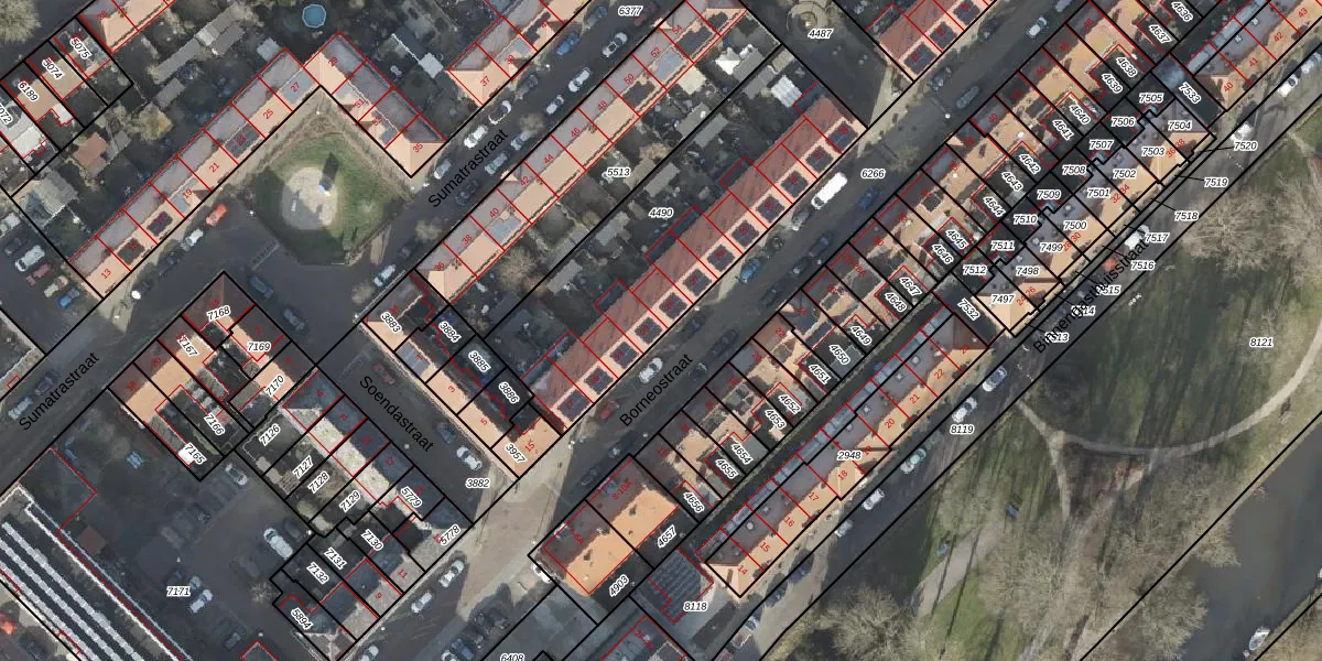 Het perceel waarop Borneostraat 23 staat heeft een oppervlakte van 1189 m². Dit is een zeer groot perceel. De perceeloppervlakte wordt geregistreerd door het Kadaster. Gedetailleerde informatie over de maten van dit perceel kunt u vinden in het rapport Kadastrale kaart met maatvoering van Borneostraat 23.