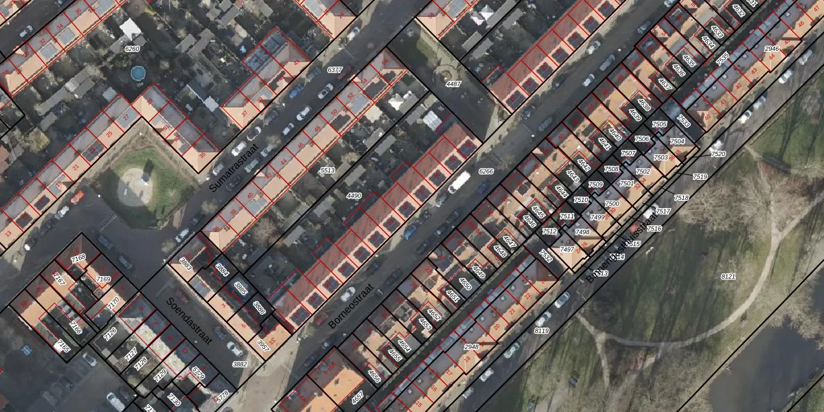 Het perceel waarop Borneostraat 31 staat heeft een oppervlakte van 1189 m². Dit is een zeer groot perceel. De perceeloppervlakte wordt geregistreerd door het Kadaster. Gedetailleerde informatie over de maten van dit perceel kunt u vinden in het rapport Kadastrale kaart met maatvoering van Borneostraat 31.
