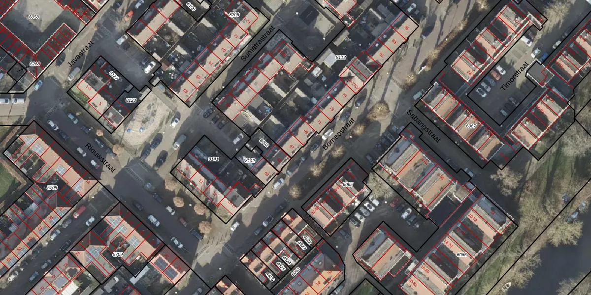 Het perceel waarop Borneostraat 67 staat heeft een oppervlakte van 2285 m². Dit is een zeer groot perceel. De perceeloppervlakte wordt geregistreerd door het Kadaster. Gedetailleerde informatie over de maten van dit perceel kunt u vinden in het rapport Kadastrale kaart met maatvoering van Borneostraat 67.