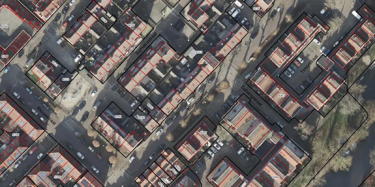 Het perceel waarop Borneostraat 71 staat heeft een oppervlakte van 2285 m². Dit is een zeer groot perceel. De perceeloppervlakte wordt geregistreerd door het Kadaster. Gedetailleerde informatie over de maten van dit perceel kunt u vinden in het rapport Kadastrale kaart met maatvoering van Borneostraat 71.