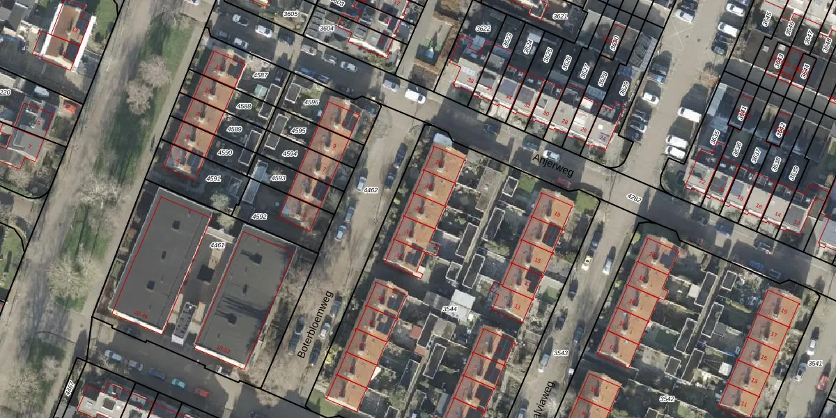 Het perceel waarop Boterbloemweg 16 staat heeft een oppervlakte van 3265 m². Dit is een zeer groot perceel. De perceeloppervlakte wordt geregistreerd door het Kadaster. Gedetailleerde informatie over de maten van dit perceel kunt u vinden in het rapport Kadastrale kaart met maatvoering van Boterbloemweg 16.