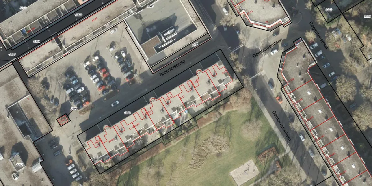 Het perceel waarop Broederschap 5 staat heeft een oppervlakte van 2165 m². Dit is een zeer groot perceel. De perceeloppervlakte wordt geregistreerd door het Kadaster. Gedetailleerde informatie over de maten van dit perceel kunt u vinden in het rapport Kadastrale kaart met maatvoering van Broederschap 5.