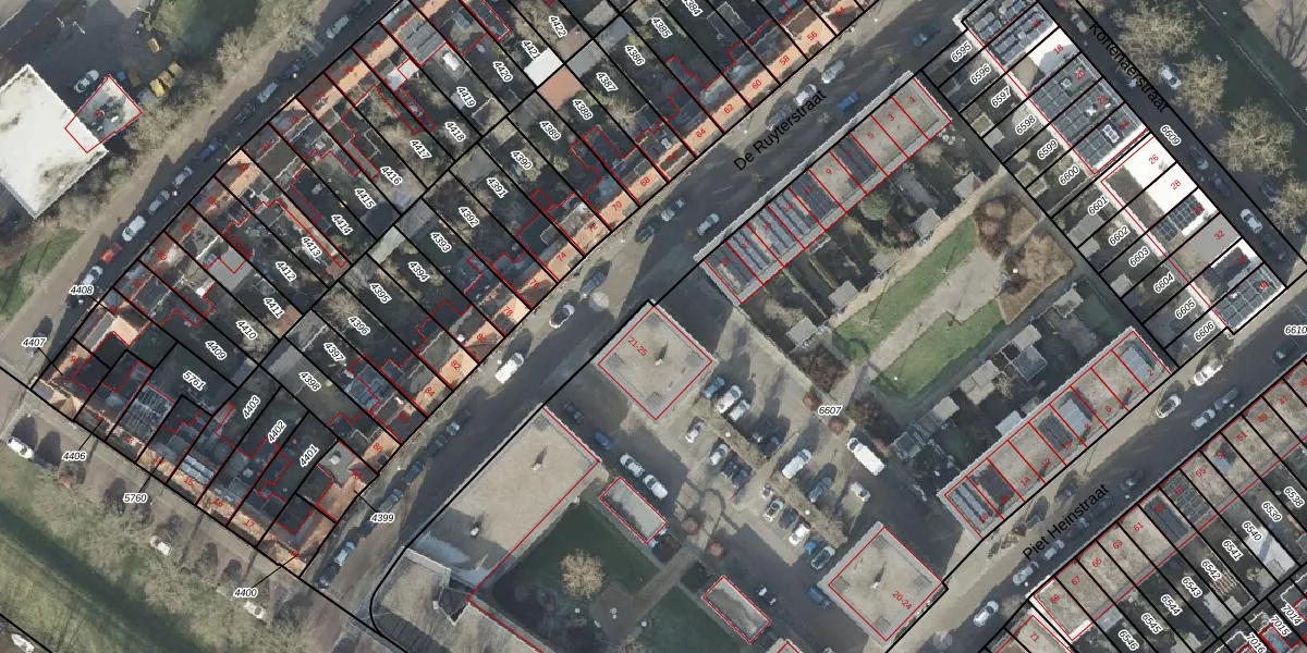Het perceel waarop De Ruyterstraat 21 staat heeft een oppervlakte van 7036 m². Dit is een zeer groot perceel. De perceeloppervlakte wordt geregistreerd door het Kadaster. Gedetailleerde informatie over de maten van dit perceel kunt u vinden in het rapport Kadastrale kaart met maatvoering van De Ruyterstraat 21.