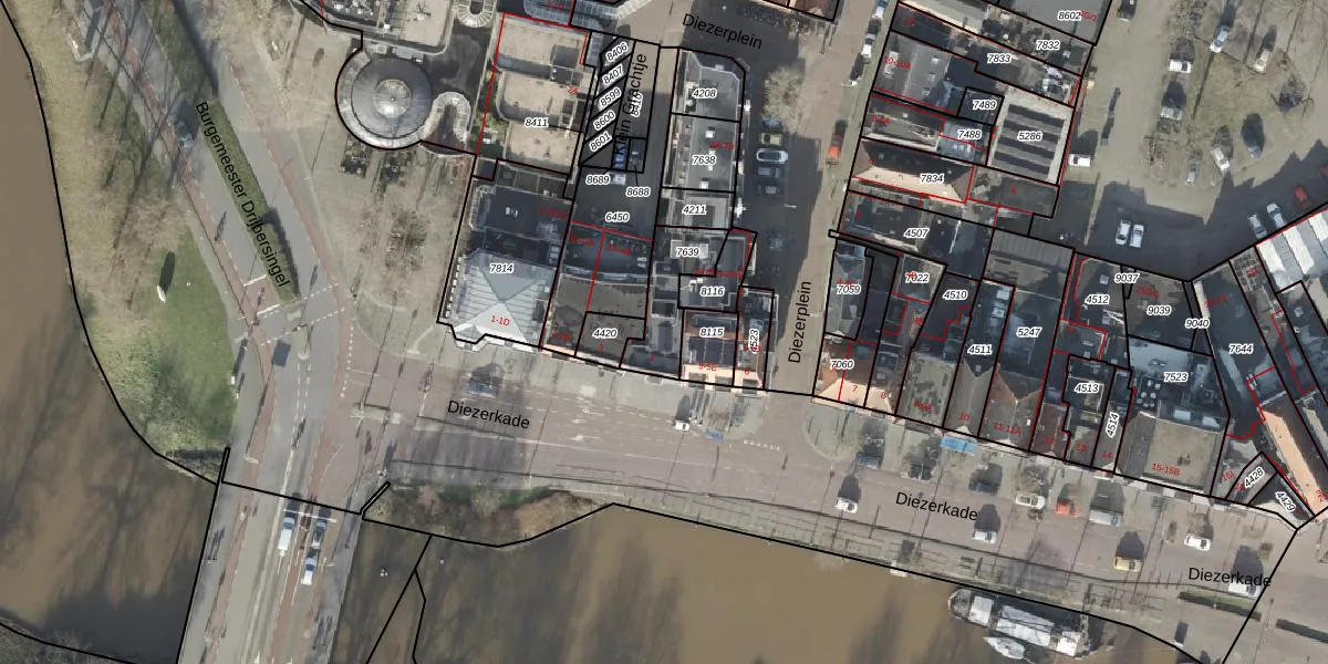 Diezerplein 1-103 is gelegen op kadastraal perceel ZLE00A7639. Deze kadastrale aanduiding is uniek en wordt gebruikt door het Kadaster om eigendomsrechten en andere zakelijke rechten vast te leggen. Het perceel maakt onderdeel uit van de kadastrale gemeente Zwolle.