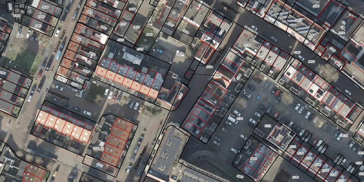 Het perceel waarop Eerste Baan 6 staat heeft een oppervlakte van 62 m². Dit is een klein perceel. De perceeloppervlakte wordt geregistreerd door het Kadaster. Gedetailleerde informatie over de maten van dit perceel kunt u vinden in het rapport Kadastrale kaart met maatvoering van Eerste Baan 6.