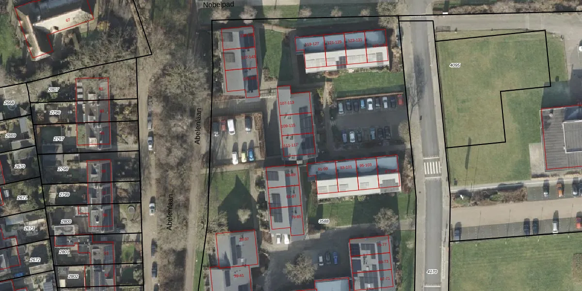 Het perceel waarop Erasmuslaan 111 staat heeft een oppervlakte van 8405 m². Dit is een zeer groot perceel. De perceeloppervlakte wordt geregistreerd door het Kadaster. Gedetailleerde informatie over de maten van dit perceel kunt u vinden in het rapport Kadastrale kaart met maatvoering van Erasmuslaan 111.
